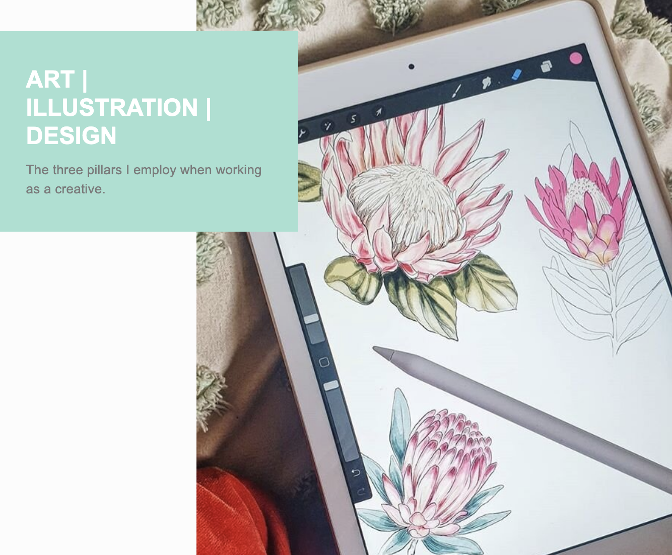IN SUMMARY: when I work with clients, or even alone, I use art, illustration and design to develop concepts into reality. Being a creative means you are a visual person and you have a skill that can help people and their businesses share their ideas or visions with the world. Whether it’s designing a homewares range, illustrating a suite of wedding invitations, or painting a large picture - art, design and illustration all come to play significant roles in creating a successful end result.